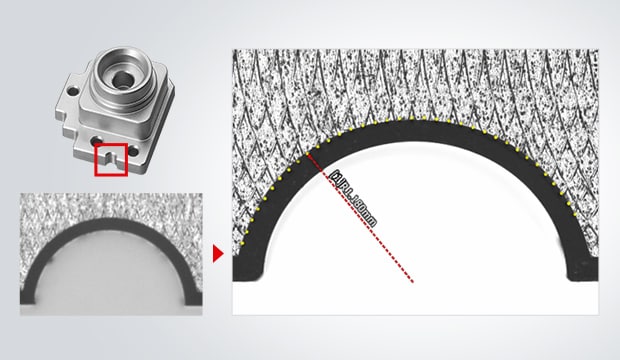 La sonda táctil de baja presión de medición se mueve libremente en vertical, horizontal y en ángulo, lo que permite medir los puntos deseados con un toque suave. Incluso las piezas con formas 3D se pueden medir con precisión.