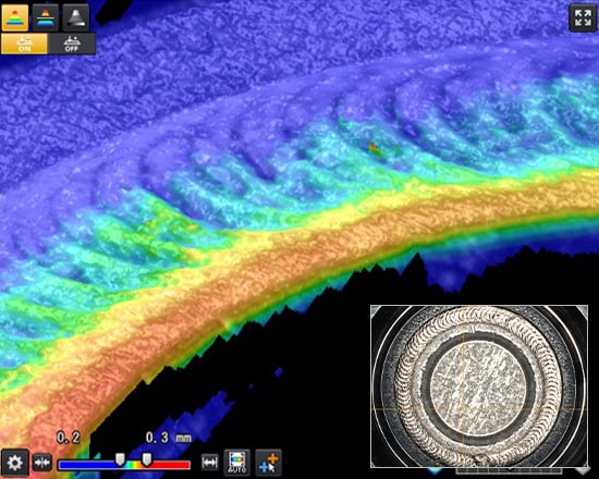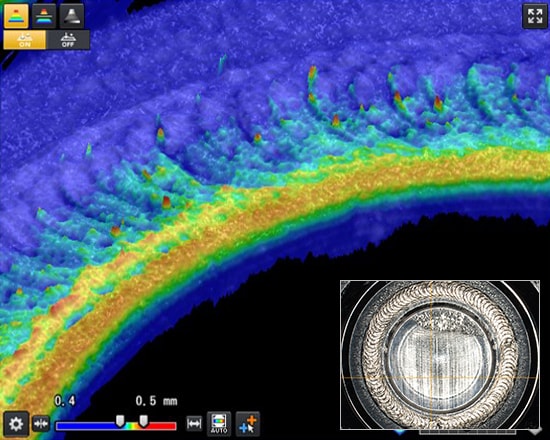 Tanto la Serie LJ-V7000 como la Serie LJ-X8000 admiten medición e inspección avanzada de perfiles 3D, sin mencionar la inspección de perfiles 2D mediante medición de perfil en línea. La Serie LJ-X8000 logra 3200 píxeles a lo largo del eje X por perfil, lo que permite una medición de perfil de ultra alta definición tanto en el eje X como en el eje Z. Estos perfilómetros láser son capaces de capturar con precisión características de perfil muy pequeñas. La Serie LJ-V7000 proporciona muestreo de alta velocidad, hasta 64 kHz, contribuyendo a tiempos de ciclo más cortos mediante medición e inspección en línea rápida y precisa. Ambas series adoptan un láser azul, que ofrece medición e inspección estable sin verse afectadas por el material, el color o las condiciones de temperatura del objetivo.