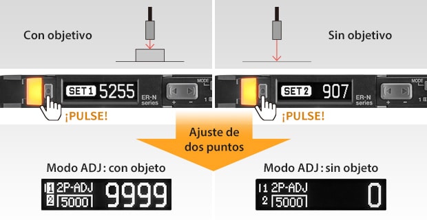 El botón ADJ del sensor permite una fácil sintonización automática usando un algoritmo de doble referencia, lo que maximiza el margen de detección—incluso cuando las señales del objeto y el fondo son similares.