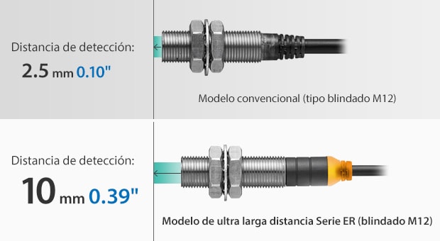 La Serie ER posibilita una detección a ultra larga distancia. Eso permite una instalación más alejada del objetivo, lo cual reduce, en gran medida, el riesgo de daños causados por el impacto y la abrasión. También evita detecciones falsas causadas por vibraciones o falta de alineación. El nuevo método de detección por oscilación de pulso + doble bobina permite el montaje al ras del metal y la detección a gran distancia sin interferencia del metal circundante.