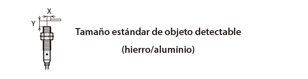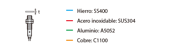 Variación de la distancia de detección según el tamaño y el material del objeto detectable (Ejemplo típico)