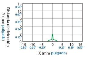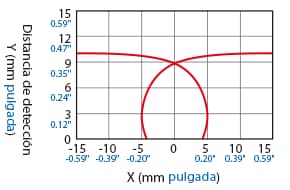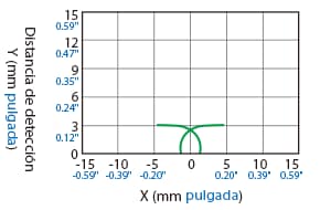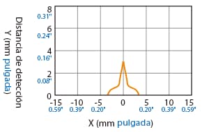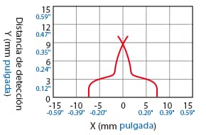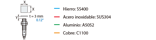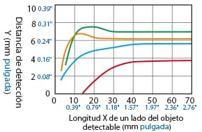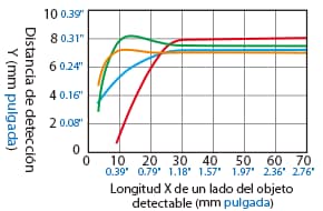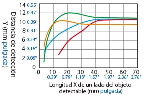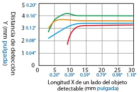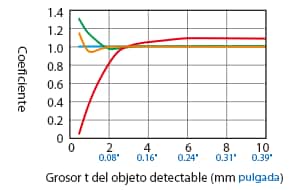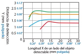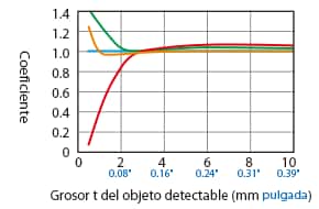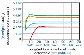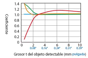 La distancia de detección varía según el material, el tamaño y el grosor del objeto detectable. La distancia de detección se puede comprobar usando un objeto detectable multiplicando la distancia de detección Y (mm pulgada) del diagrama de características “Variación de la distancia de detección según el tamaño y material del objeto detectable” por el coeficiente del siguiente diagrama de características.