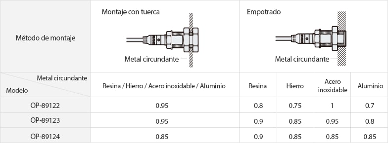 La distancia de detección disminuye cuando se usa el soporte Quick-Swap. La distancia de detección también cambia con las instalaciones al ras dependiendo del material del metal circundante. Use los siguientes factores multiplicados por la distancia de detección en las especificaciones como guía.