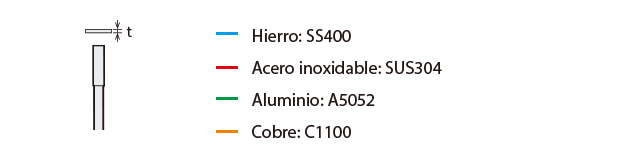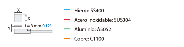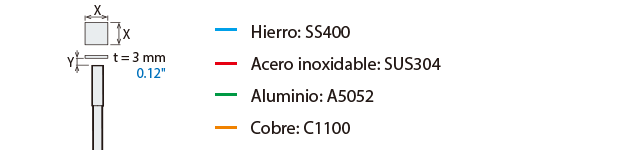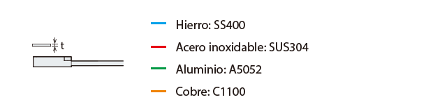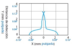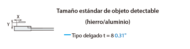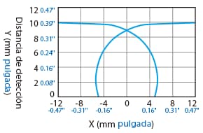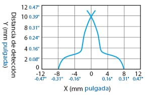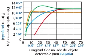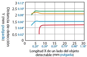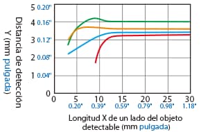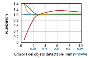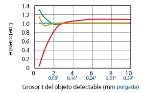 La distancia de detección varía según el material, el tamaño y el grosor del objeto detectable. La distancia de detección se puede comprobar usando un objeto detectable multiplicando la distancia de detección Y (mm pulgada) del diagrama de características “Variación de la distancia de detección según el tamaño y material del objeto detectable” por el coeficiente del siguiente diagrama de características.