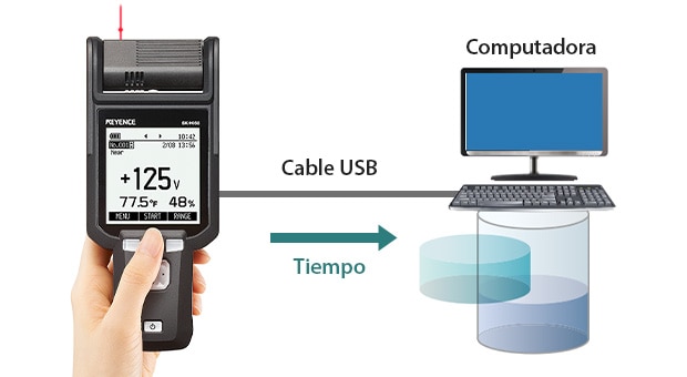 Se pueden registrar hasta 100 valores de datos medidos en la memoria buffer interna del sensor. Los datos registrados se pueden transferir a través de un cable USB a una PC donde se pueden guardar como datos CSV.