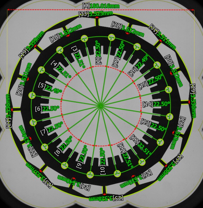 Se pueden medir instantáneamente hasta 300 características, incluso para mediciones complejas como líneas virtuales y posiciones centrales de los radios. Las comparaciones de perfiles con un dibujo CAD para verificar la forma de una pieza se pueden realizar fácilmente.