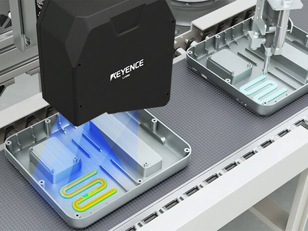 El Sensor de Instantáneas Láser 3D de la Serie LJ-S8000 puede inspeccionar el material de disipación de calor aplicado por un dispensador. Aunque la inspección simultánea del ancho y la altura es difícil con imágenes en escala de grises de los sensores de visión convencionales, la Serie LJ-S8000 escanea la forma de la superficie del objetivo para obtener información de altura que se puede utilizar para inspeccionar la altura, el ancho y el volumen de los materiales de disipación de calor. Dado que el escáner está integrado en el propio cabezal del sensor, no se requieren recursos ni tiempo adicionales para piezas auxiliares, como platinas y codificadores. Las inspecciones en línea con la Serie LJ-S8000 son tan simples como conectar el dispositivo al equipo existente.