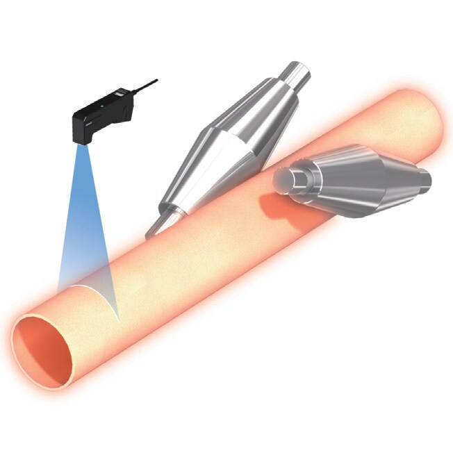 Se utiliza refrigeración por camisa de agua para medir piezas de trabajo, cuyas superficies pueden superar los 1200 °C (2192 °F) durante el proceso de perforación. Dado que el objetivo es cilíndrico, se puede medir simultáneamente desde dos direcciones utilizando dos cabezales de sensor, y también desde un ángulo. Esto permite medir el diámetro exterior durante el preprocesamiento.