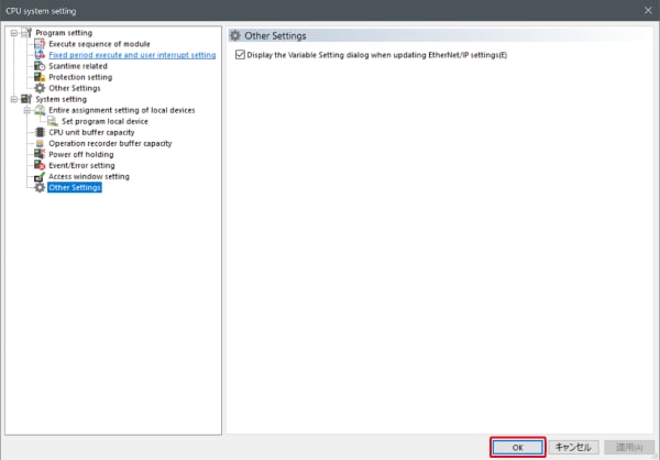 When assigning variables to the connection of EtherNet/IP®, check the box of “Displays the variable setting dialog when updating the EtherNet/IP settings (E)” for “Other settings” of “System settings” on the “CPU system settings” dialog.