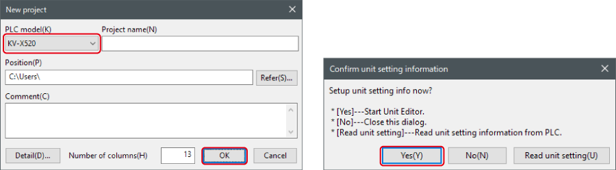 1. Start up the KV STUDIO and create a new project. Set the model option to “KV-X520” and click [OK].