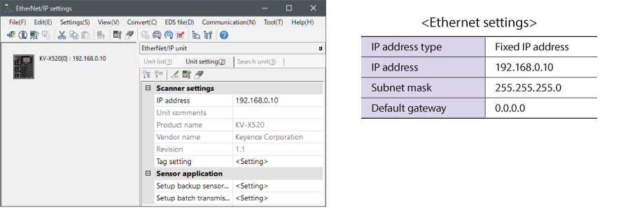 3. On the “Unit setting (2)” tab, set the IP address for KV-X Series. In this example, configure the setting as shown below.