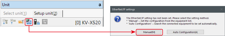 2. The unit editor is displayed. On the “Setup unit(2)” tab, click the icon of EtherNet/IP setting. A configuration type selection dialog box is displayed. Click [Manual (M)].