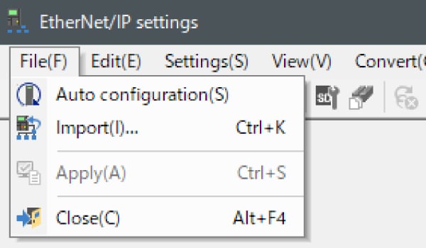 5. With the KV-X Series and the EtherNet/IP devices connected using the Ethernet cable, select [File (F)] → [Auto configuration (S)] on the [EtherNet/IP settings] window.