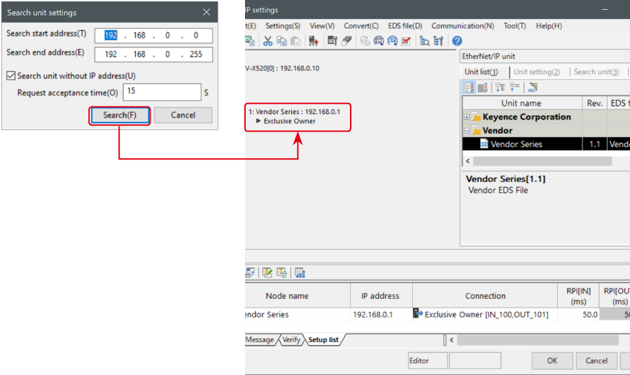 7. When transfer of the project is completed, the [Search unit settings] dialog is displayed. Then click [Search (F)]. After the auto configuration is completed, "Vendor Series" is automatically registered. Then click [OK] to close the [EtherNet/IP settings] window.
