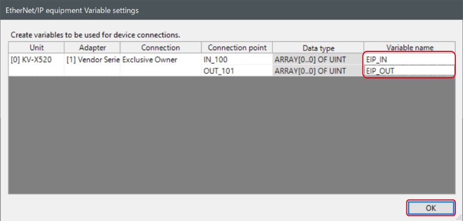 When the box of "Displays the variable setting dialog when updating the EtherNet/IP settings (E)" is checked, at the timing when the EtherNet/IP setting is updated and the changed content of the unit editor is confirmed, a dialog to assign variables to the connection is displayed.