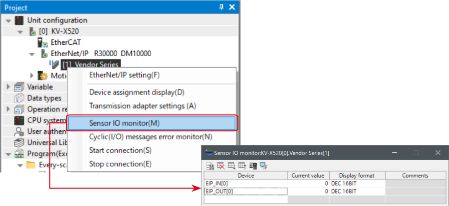 3. Right-click on “Vender Series” in the workspace, and select [Sensor IO monitor (M)].