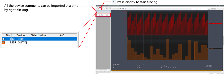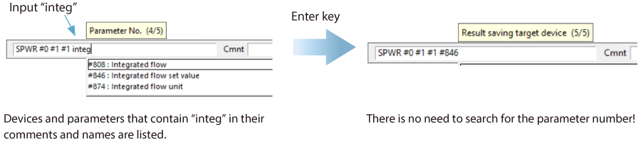 When you use a ladder program, you can input device comments or parameter names directly to have input candidates be searched for and displayed automatically.