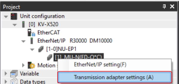 1. Expand the unit configuration in the workspace. Right-click on "Vender Series" and select [Transmission adapter settings (A)].