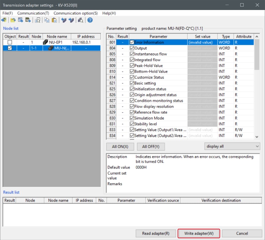 Click [Write adapter (W)] to write the setting value to the sensor.