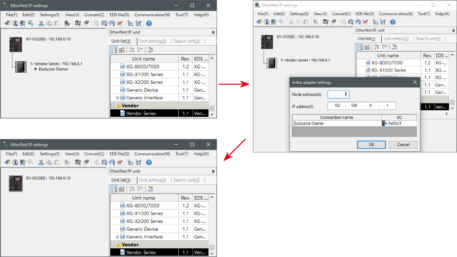 In the [Unit list (1)] tab of “EtherNet/IP Settings”, drag and drop "Vendor Series" and create a device configuration.