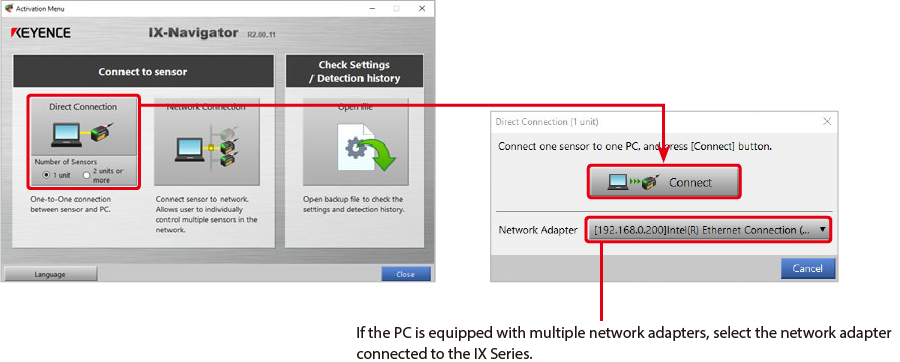 1. Connect the Ethernet ports on the PC and the IX Series (the sensor amplifier) with a LAN cable, and then start IX-Navigator. The [Activation Menu] dialog box is displayed. Select “1 unit,” and then click [Direct Connection] followed by [Connect].