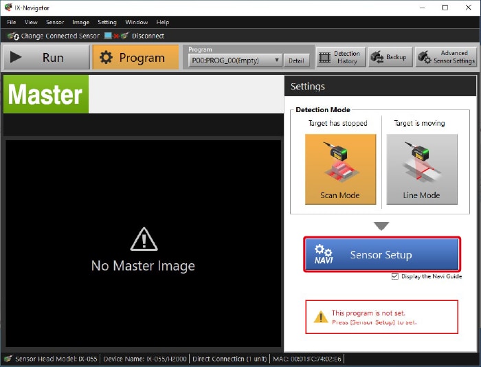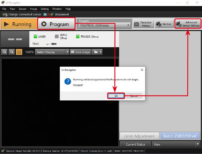 2. The sensor operation screen is displayed. If the sensor is running, click [Program]. A dialog box to confirm that you want to stop operation is displayed. Click [OK], and then click [Advanced Sensor Settings].