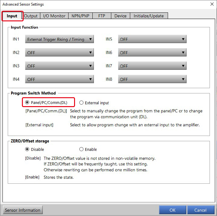 3. The [Advanced Sensor Settings] dialog box is displayed. Click the “Input” tab, and then select “Panel/PC/Comm. (DL)” under “Program Switch Method.”