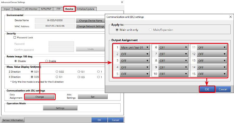 4. Click the “Device” tab. Click [Change] under “Communication unit (DL) settings.” The [Communication unit (DL) settings] dialog box is displayed. Assign measured values to outputs to be read by the KV Series, and then click [OK]. You can adjust settings and perform communication for up to 15 measured values (when using an expansion unit, the maximum is 15 measured values in total for the expansion unit and the main unit).