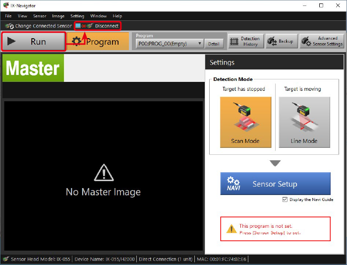 6. Click [ ▶ Run] to switch the sensor to run mode. Then, click [Disconnect] to complete the settings.