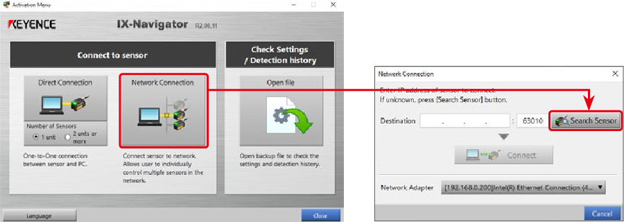 1. Connect the Ethernet ports on the PC and the IX Series (the sensor amplifier) with a LAN cable, and then start IX-Navigator. The [Activation Menu] dialog box is displayed. Click [Network Connection] followed by [Search Sensor].