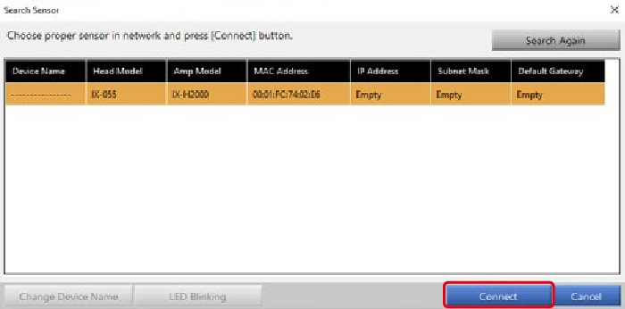 2. When the search is finished, the IX Series unit that is connected to the PC is displayed. Click [Connect]. If an IP address has already been set, the sensor settings screen will be displayed when you click [Connect].