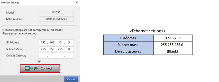 3. If no IP address has been set, the [Network Settings] dialog box is displayed. Set the IP address to assign to the unit. Configure the settings as shown below, and click [Connect] to display the sensor settings screen.