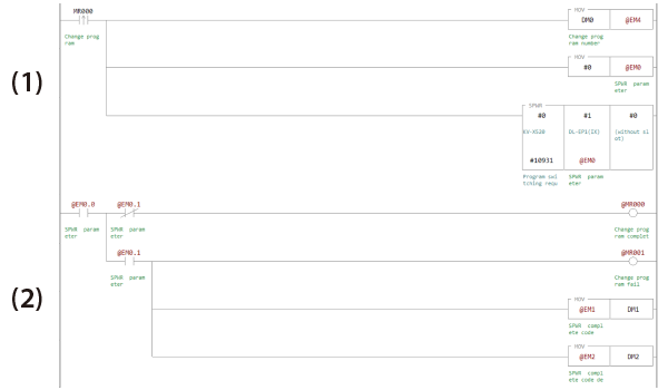 (2) When the program switch is successful, @MR000 is turned ON. If the program switch fails, @MR001 is turned ON and the completion code and the detailed completion code are stored in DM1 and DM2, respectively.
