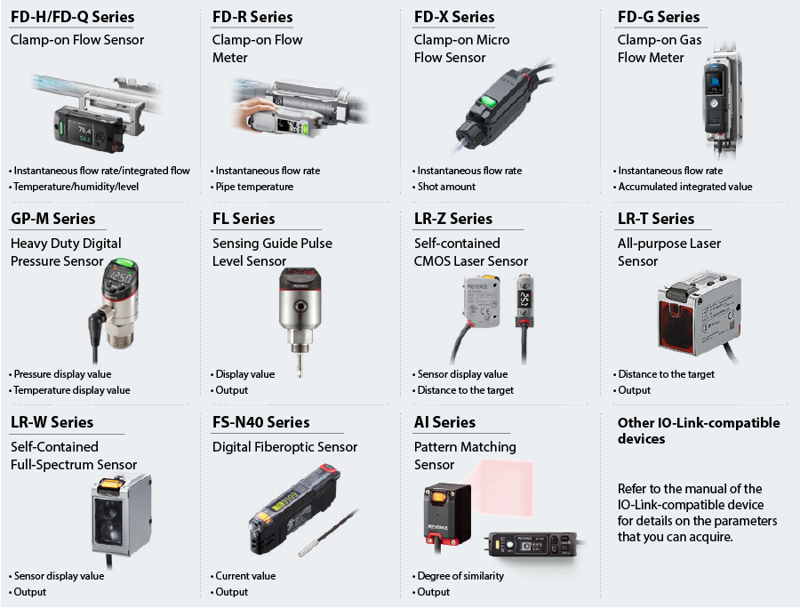The IO-Link devices that you can connect to the NQ Series and typical examples of the parameters that you can acquire are shown below.