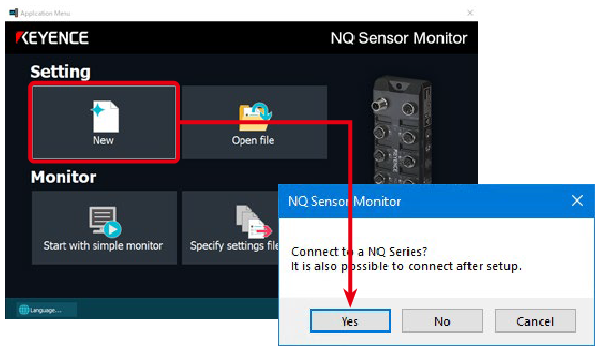 1. Start NQ Sensor Monitor and click [New]. A dialog box confirming that you want to connect to the NQ Series is displayed. Click [Yes].