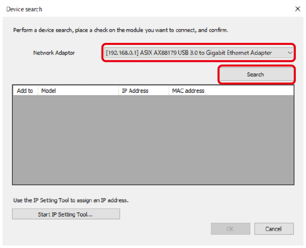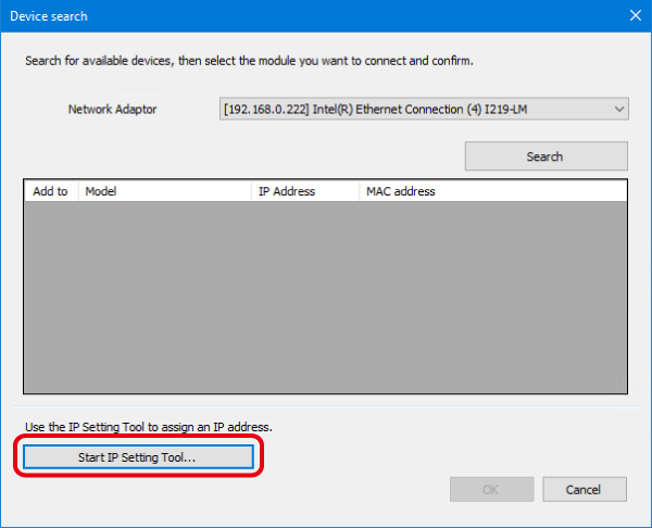 2. The [Device search] dialog box appears. Click [Start IP Setting Tool].