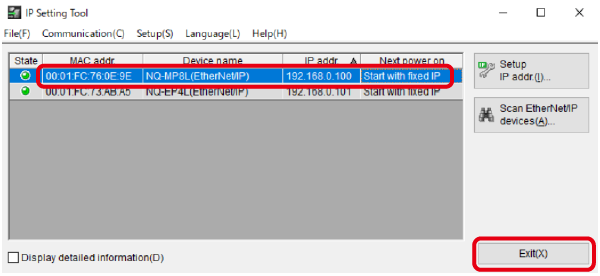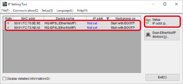 3. IP Setting Tool starts. Select the NQ Series whose IP address has not been set and click [Setup IP address (I)].
