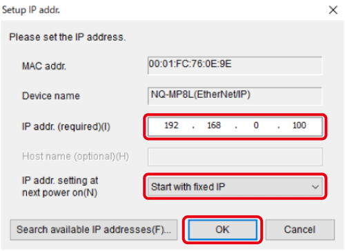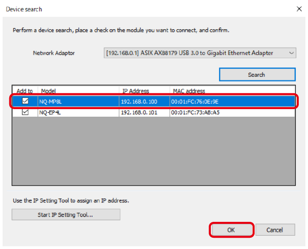 7. The NQ Series unit to which the IP address is assigned is displayed. Select this unit and click [OK].