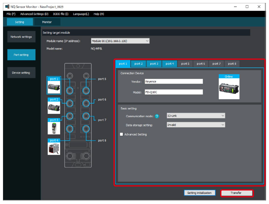 8. Click [Port setting] and check that the information of the sensor connected to the NQ Series has been applied correctly.