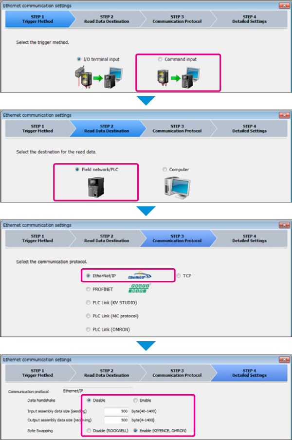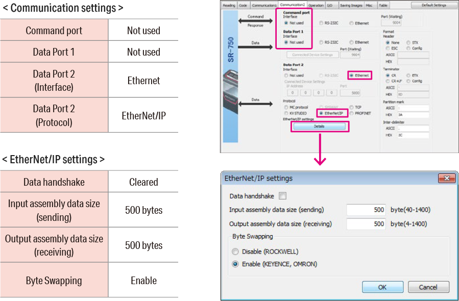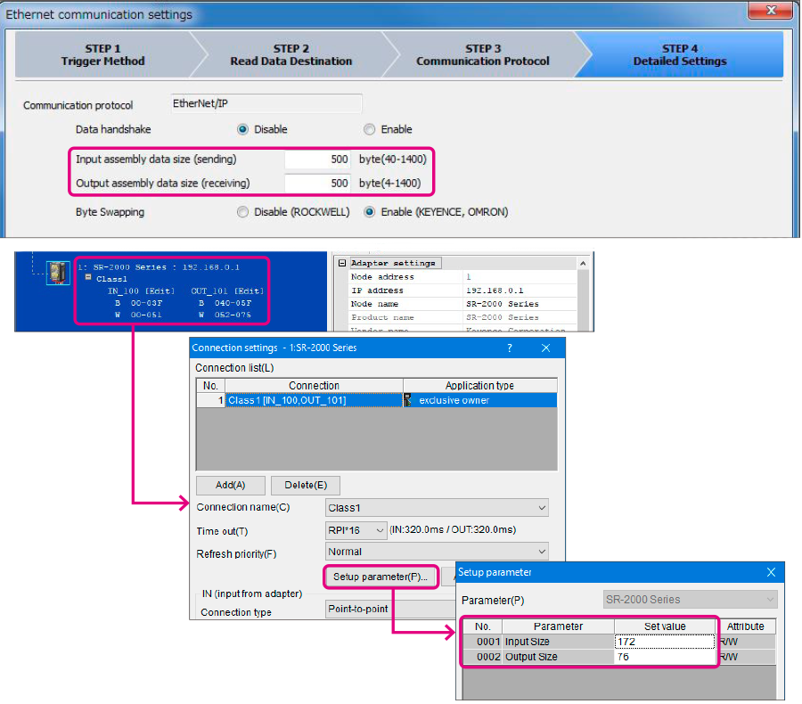 - *Communication is possible when the Input assembly data size (sending) and Output assembly data size (receiving) of the SR-X/SR Series are larger than, respectively, the Input Size and Output Size of the KV Series.