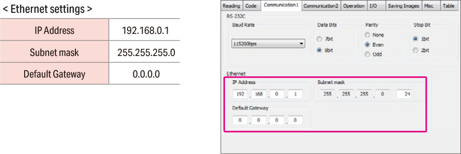 3. Select the [Communication 1] tab, and then set the IP address and subnet mask.