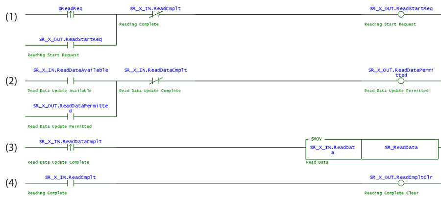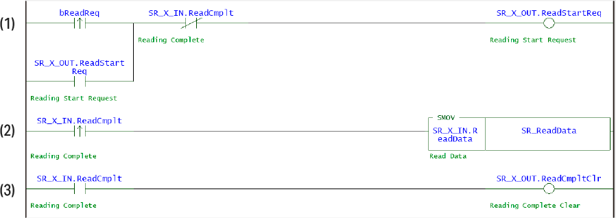 - (2) The Reading request relay (SR_X_OUT.ReadStartReq) is turned ON to execute the read request. When the Reading complete relay (SR_X_IN.ReadDataCmplt) turns ON, the Reading request relay (SR_X_OUT.ReadStartReq) is turned OFF.
