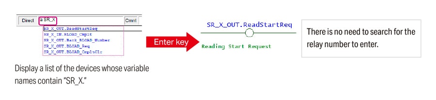 When entering operands, you can use the RT (Real-Time) Edit function to enter variables just by entering a part of the variable name. This function eliminates the hassle of searching for the variable name, which reduces the amount of man-hours spent programming.