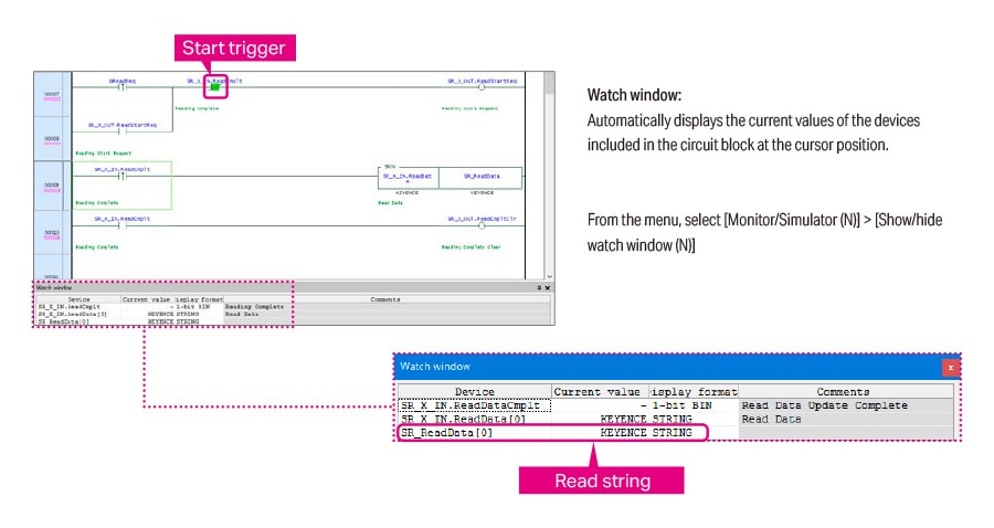 - (2) When reading is complete, SR_X_IN.ReadDataCmplt (Reading complete) turns ON and the read string is stored starting from SR_ReadData (the read string).
