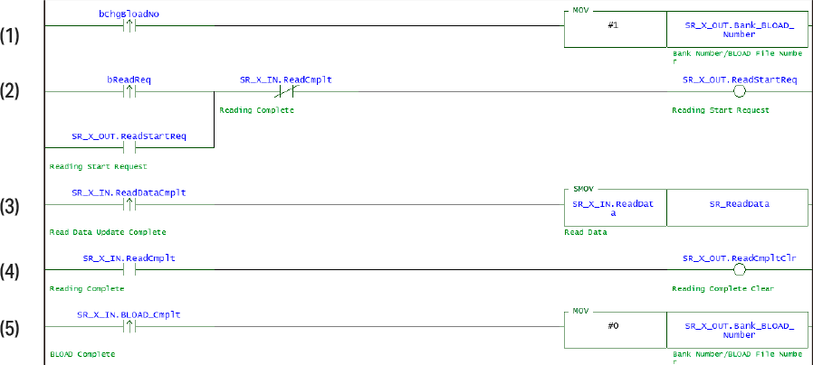 - (5) When the Reading complete relay (SR_X_IN.ReadDataCmplt) turns ON, 0 is stored in the Bank number (SR_X_OUT.Bank_BLOAD_Number).